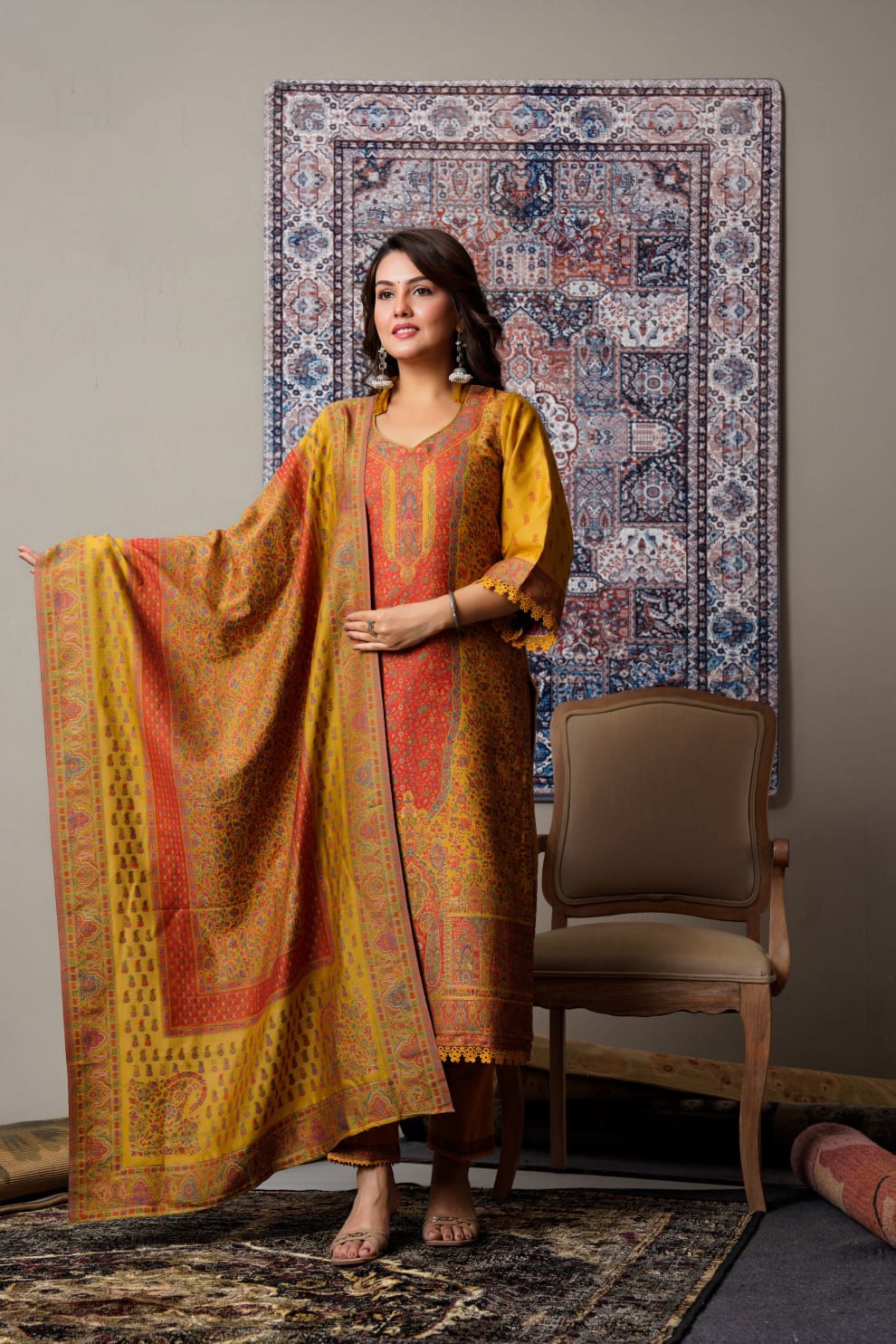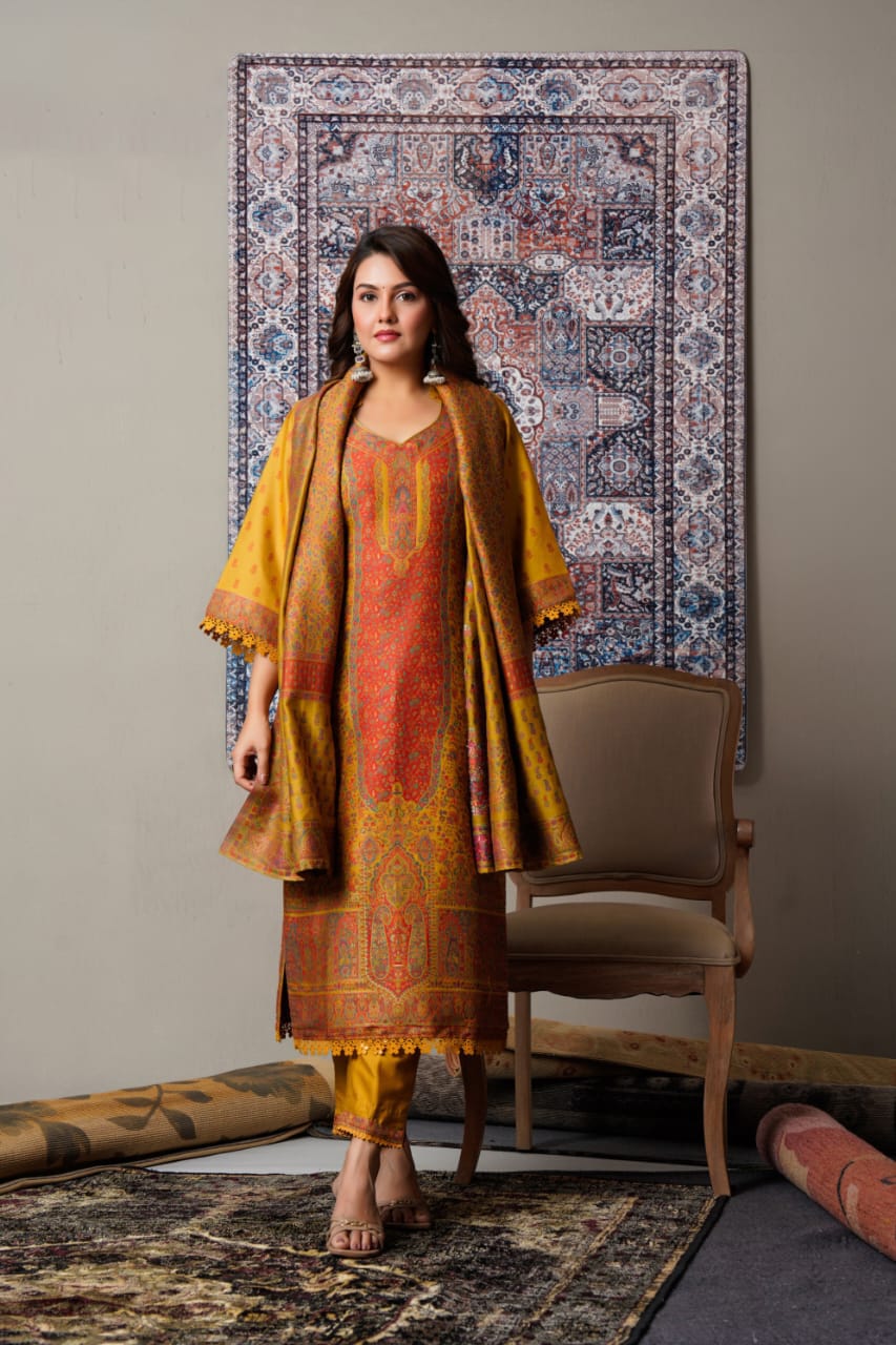 A Premium Kaani Weaving Jamawar Collection on Pure Silk Pashmina . Indulge in the grandeur of tradition with our exclusive Kaani Weaving Jamawar Collection, masterfully crafted on the finest pure silk pashmina. Each piece is a celebration of heritage, where centuries-old weaving techniques meet timeless artistry.