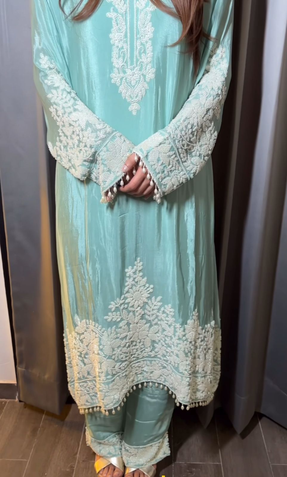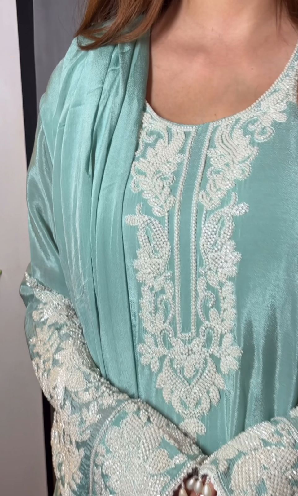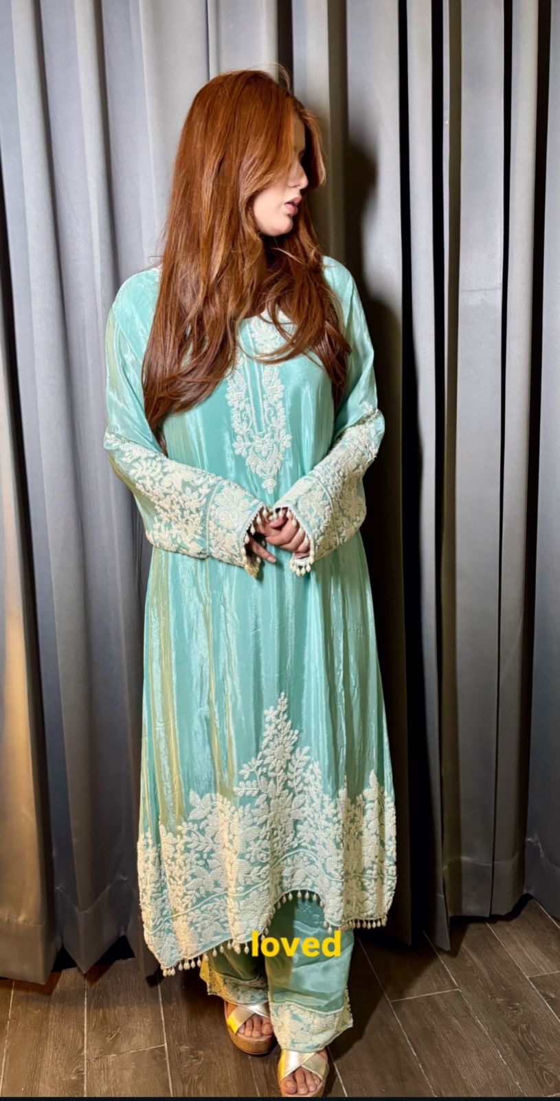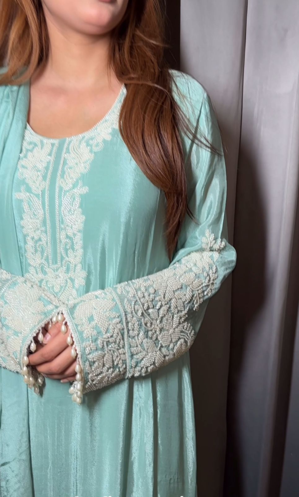 Crafted in luxurious crepe fabric, Blue Whisper features intricate handwork embroidery in serene ivory tones. The soft pastel blue hue adds a refreshing charm, beautifully balancing elegance and grace. Lightweight and effortlessly stylish, this ensemble is perfect for festive gatherings, pre-wedding celebrations, or refined daytime occasions, exuding a timeless aura of sophistication and poise.