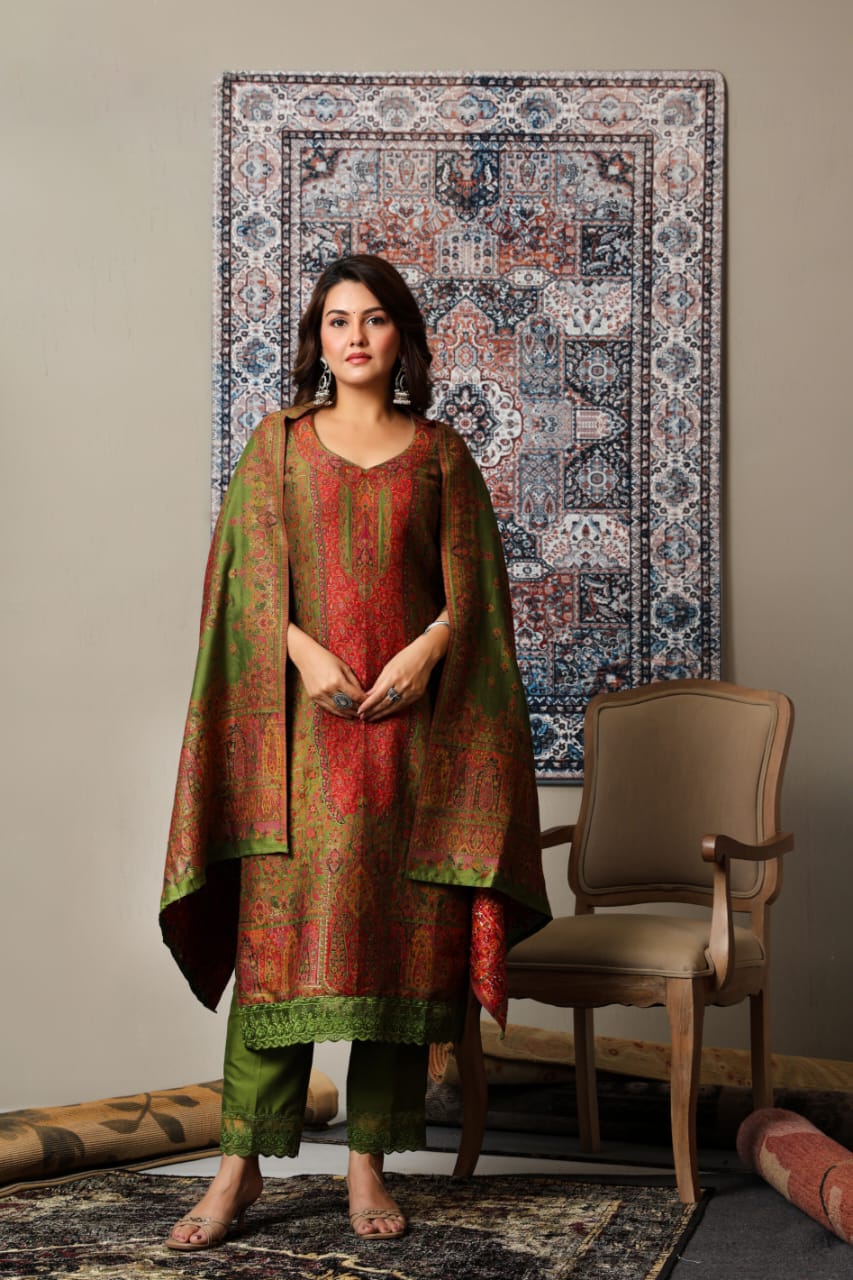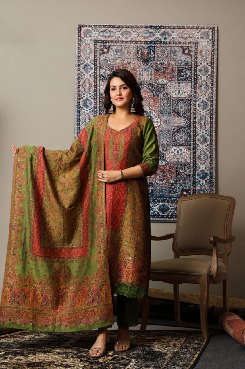 A Premium Kaani Weaving Jamawar Collection on Pure Silk Pashmina . Indulge in the grandeur of tradition with our exclusive Kaani Weaving Jamawar Collection, masterfully crafted on the finest pure silk pashmina. Each piece is a celebration of heritage, where centuries-old weaving techniques meet timeless artistry.