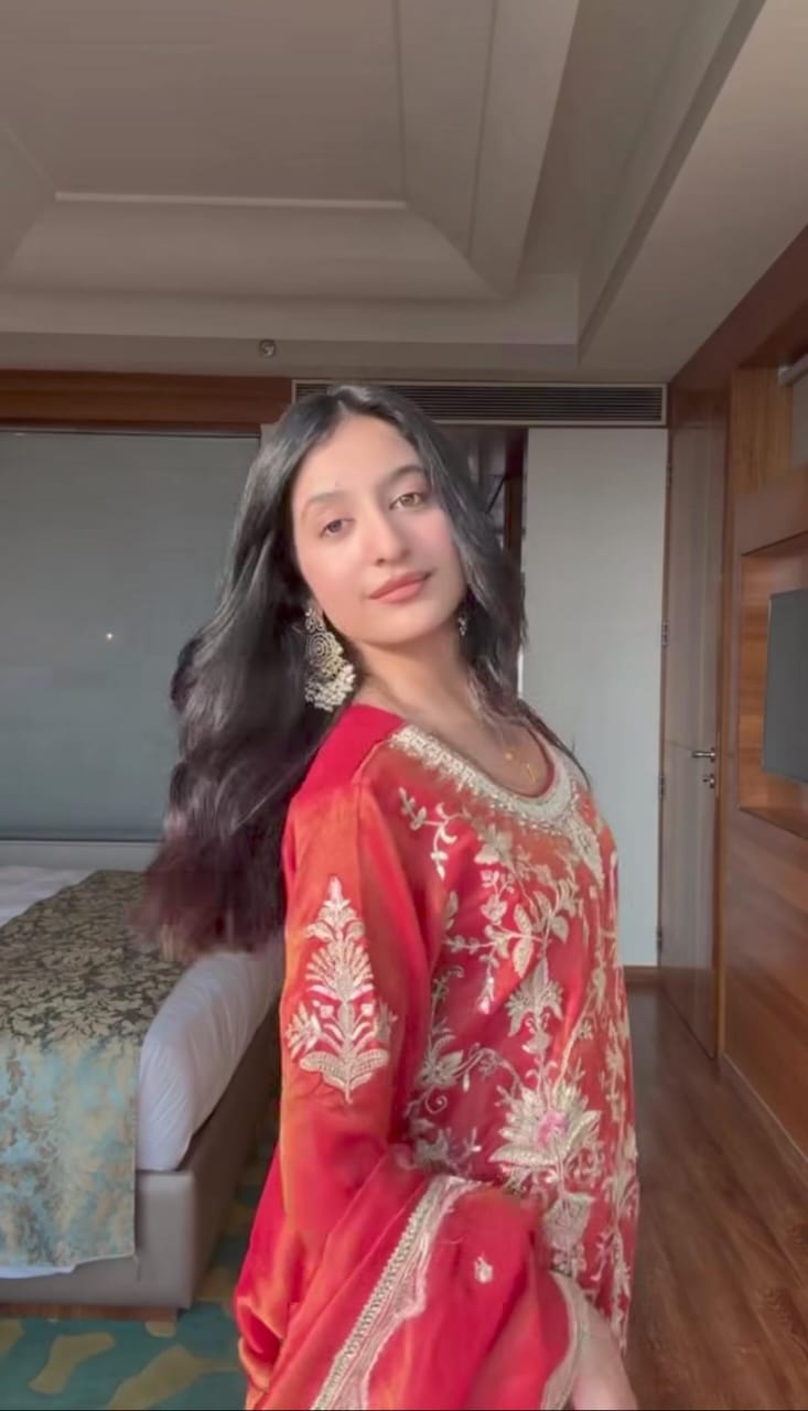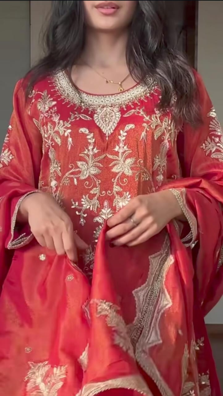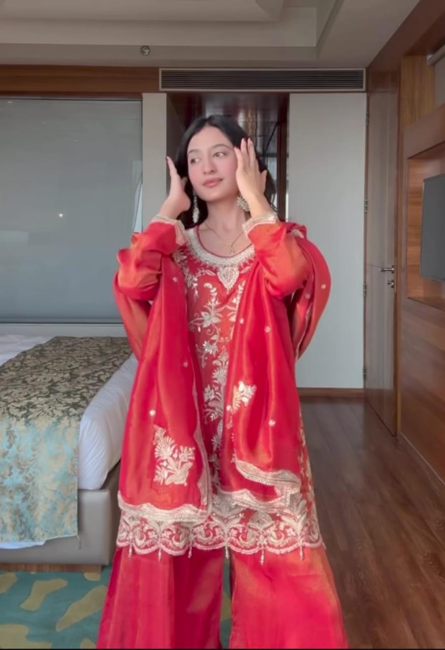 An ethereal red ensemble that glows with subtle shimmer and intricate threadwork. The suit features delicate embroidery accentuated with sequin details, giving it a graceful festive aura. Paired with wide palazzo pants adorned with floral motifs and tassel detailing, it balances elegance with a touch of modern flair. Ideal for evening gatherings and celebrations that call for timeless sophistication.