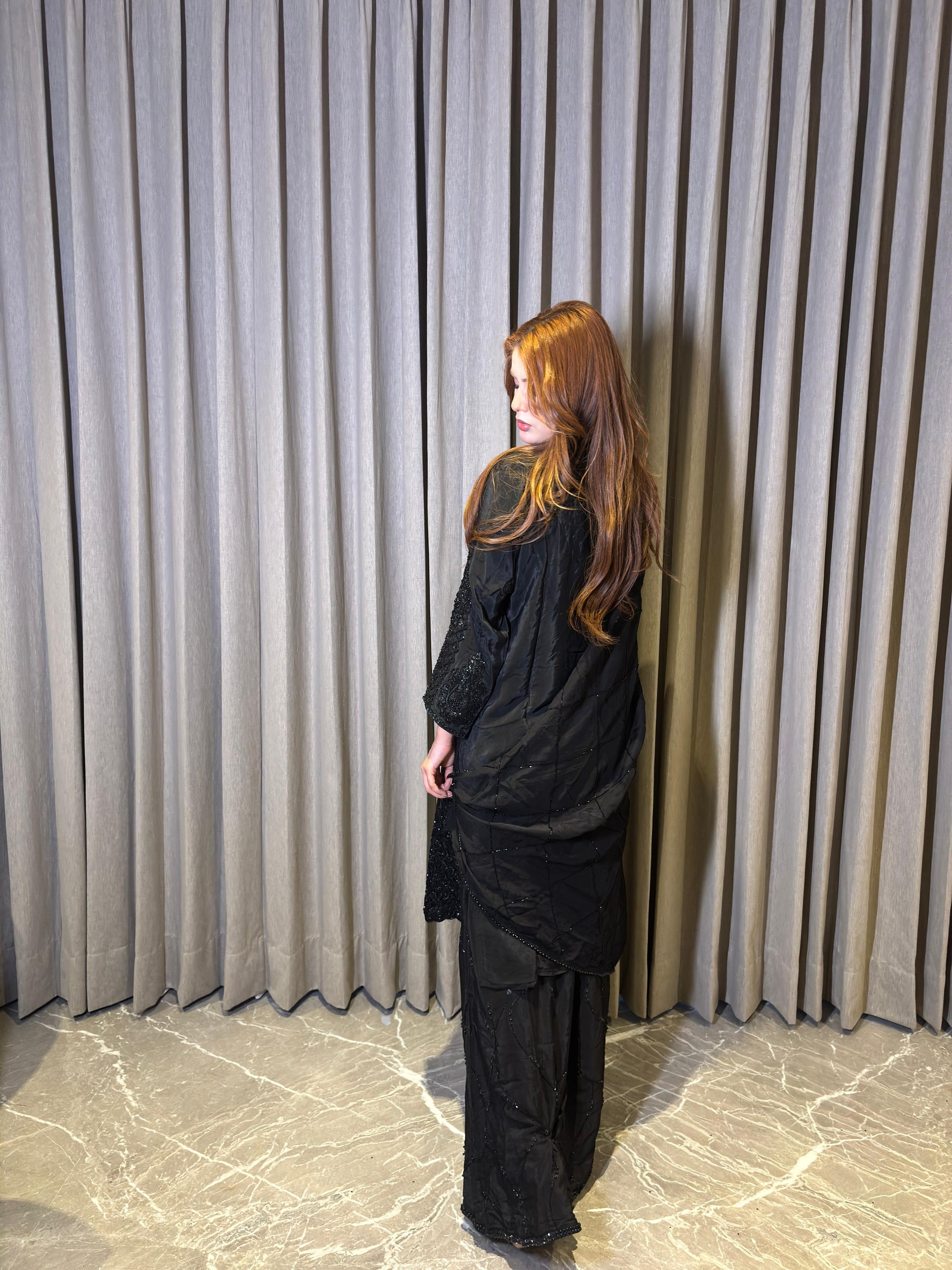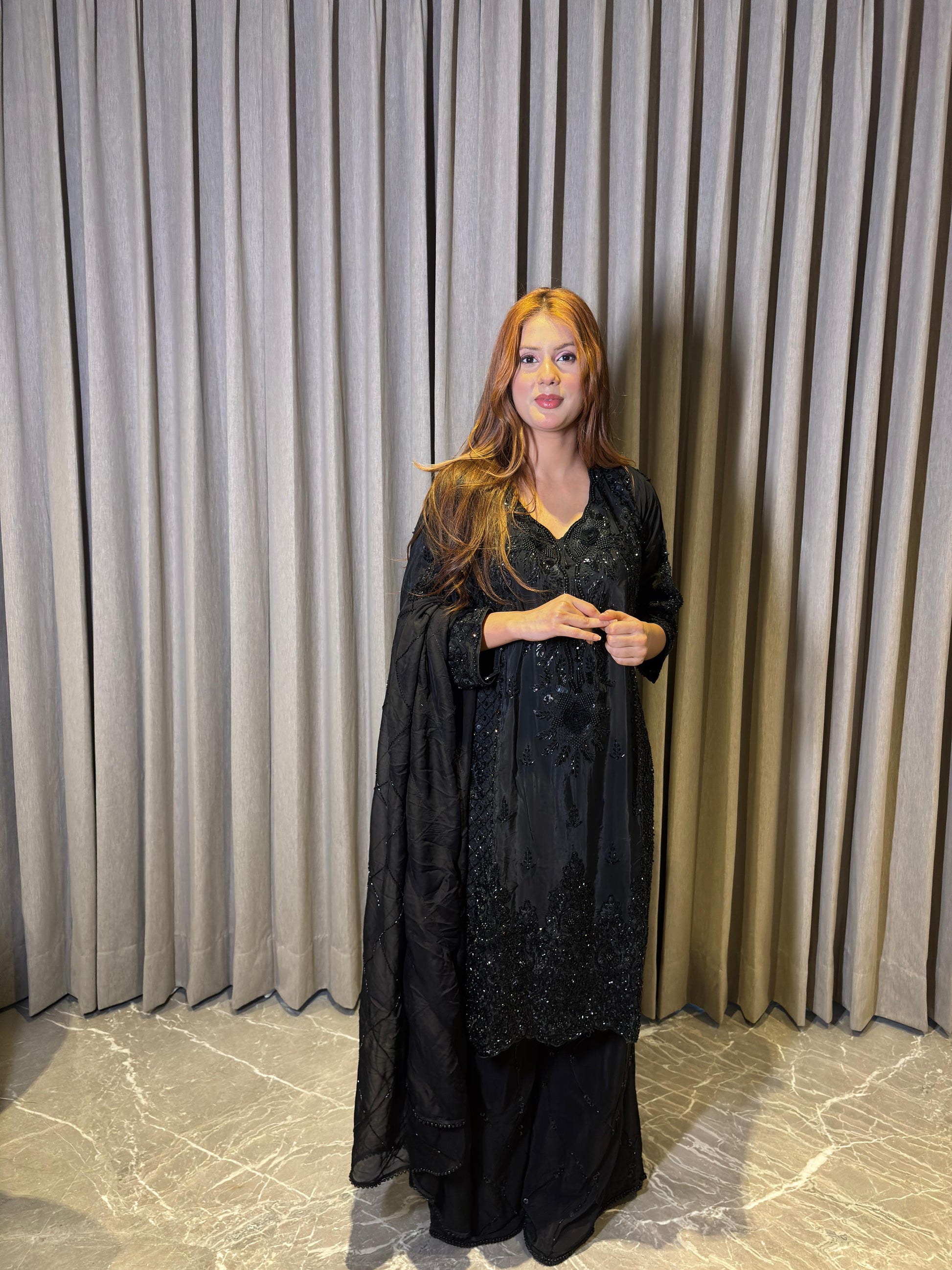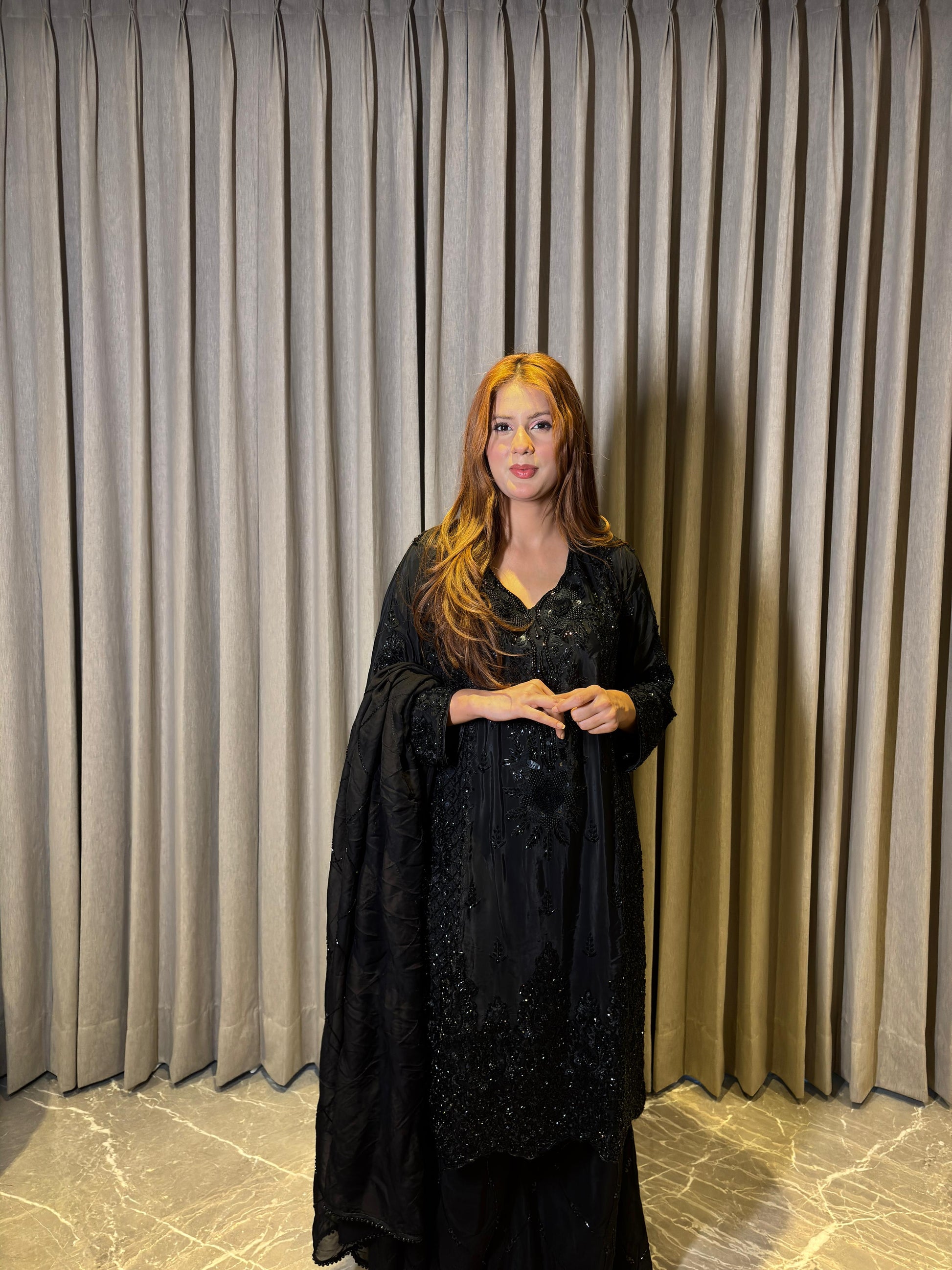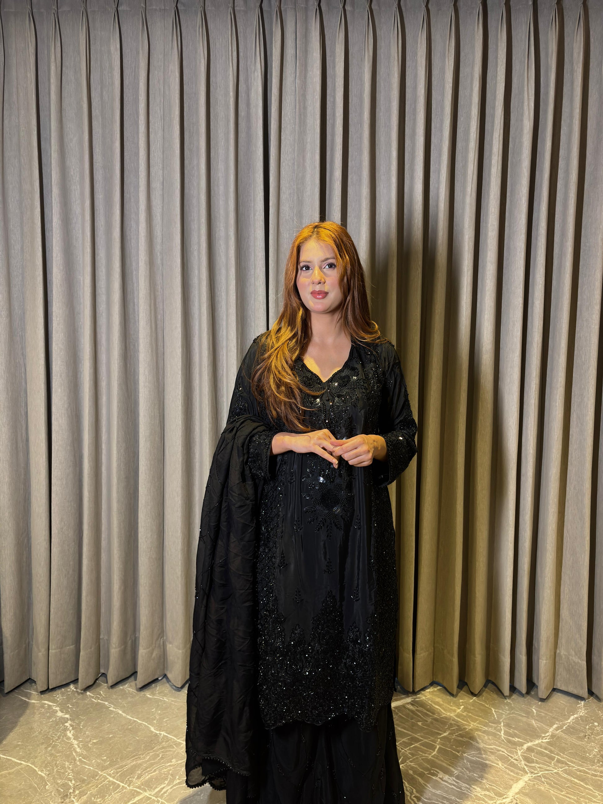A statement of understated elegance — this black crepe suit exudes timeless sophistication. Adorned with delicate tonal embroidery and subtle sequin detailing, it beautifully balances glamour with grace. The flowing silhouette paired with soft crepe fabric ensures comfort while maintaining a refined structure. Perfect for evening occasions, festive gatherings, or intimate celebrations, this ensemble speaks volumes through its quiet luxury and captivating allure.