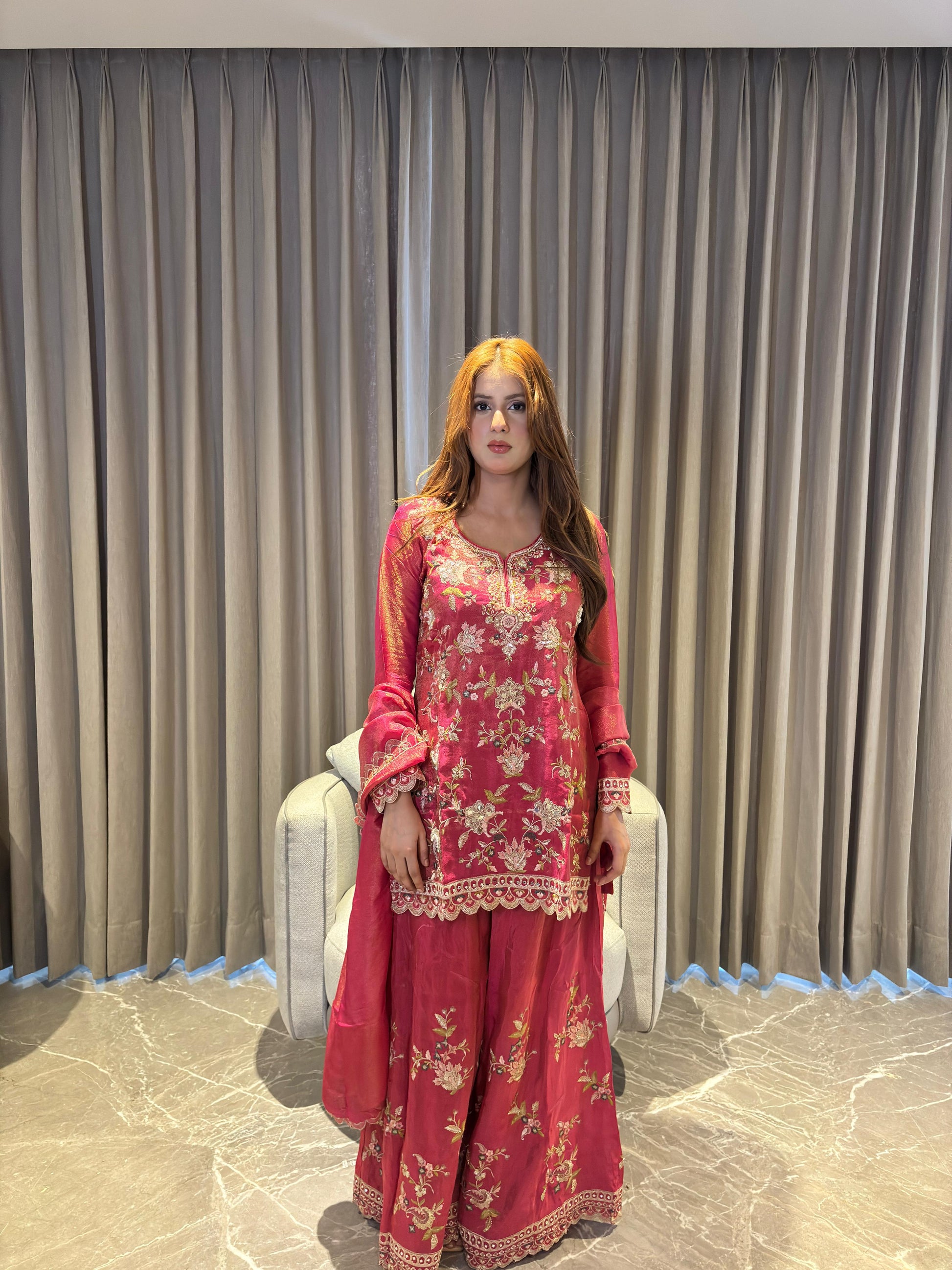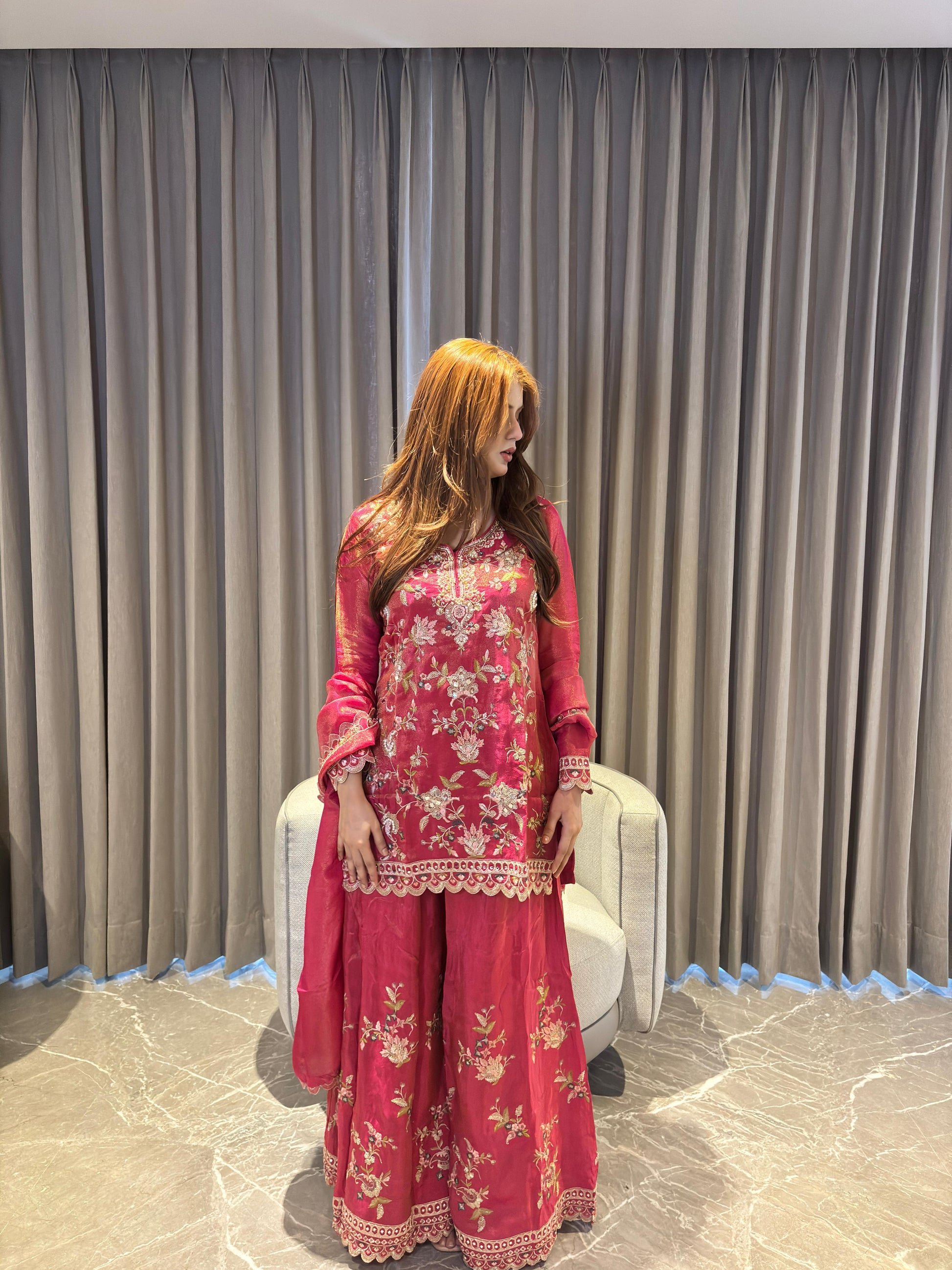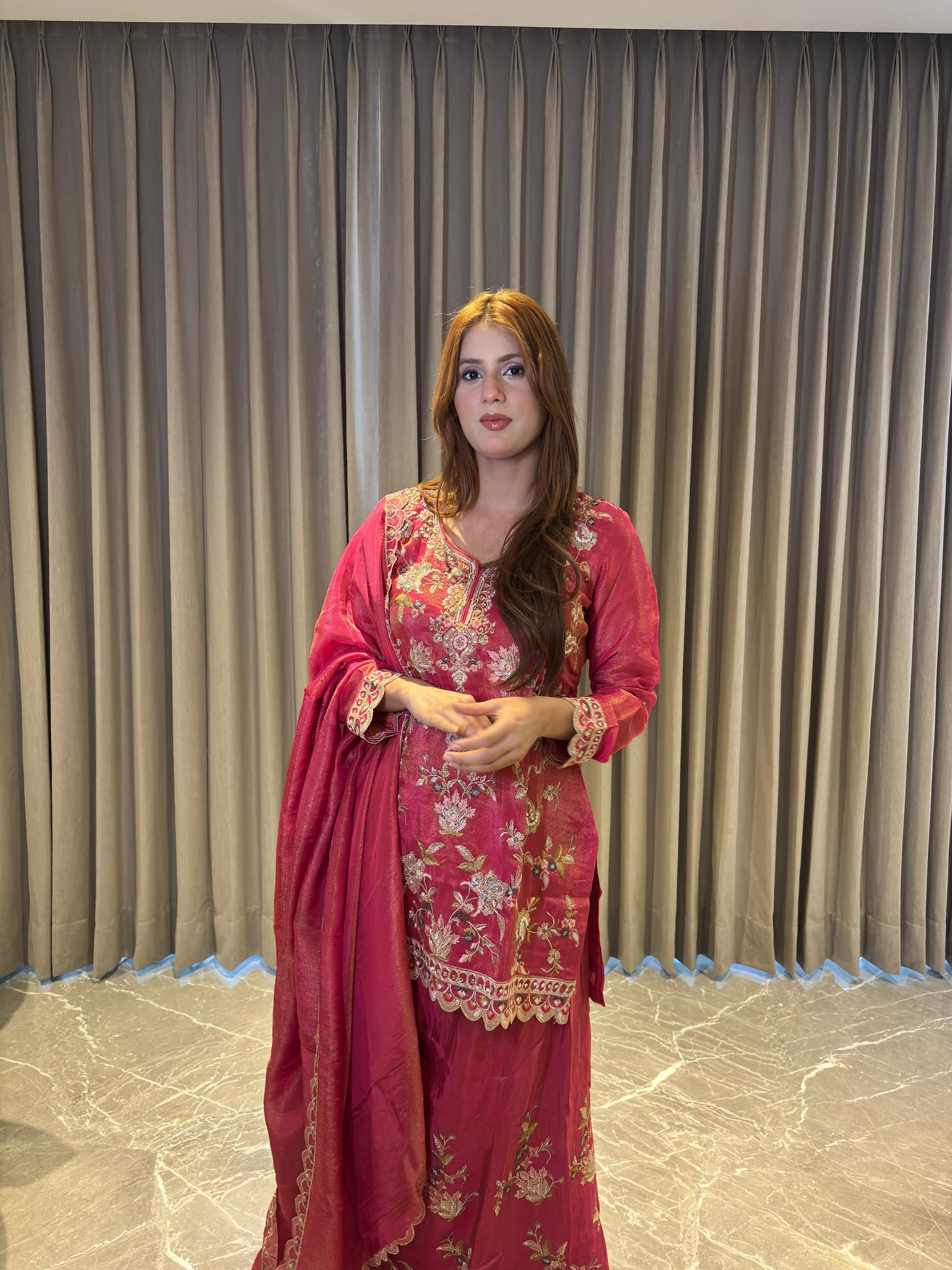 An ethereal red ensemble that glows with subtle shimmer and intricate threadwork. The suit features delicate embroidery accentuated with sequin details, giving it a graceful festive aura. Paired with wide palazzo pants adorned with floral motifs and tassel detailing, it balances elegance with a touch of modern flair. Ideal for evening gatherings and celebrations that call for timeless sophistication.