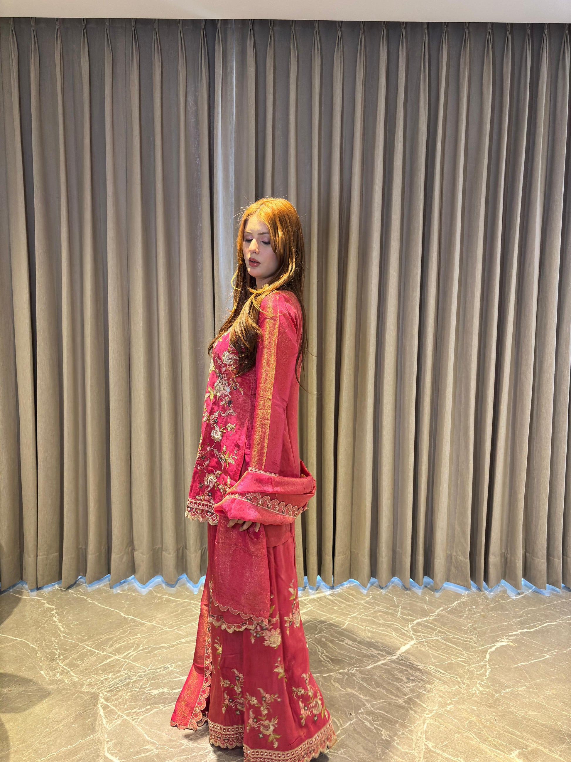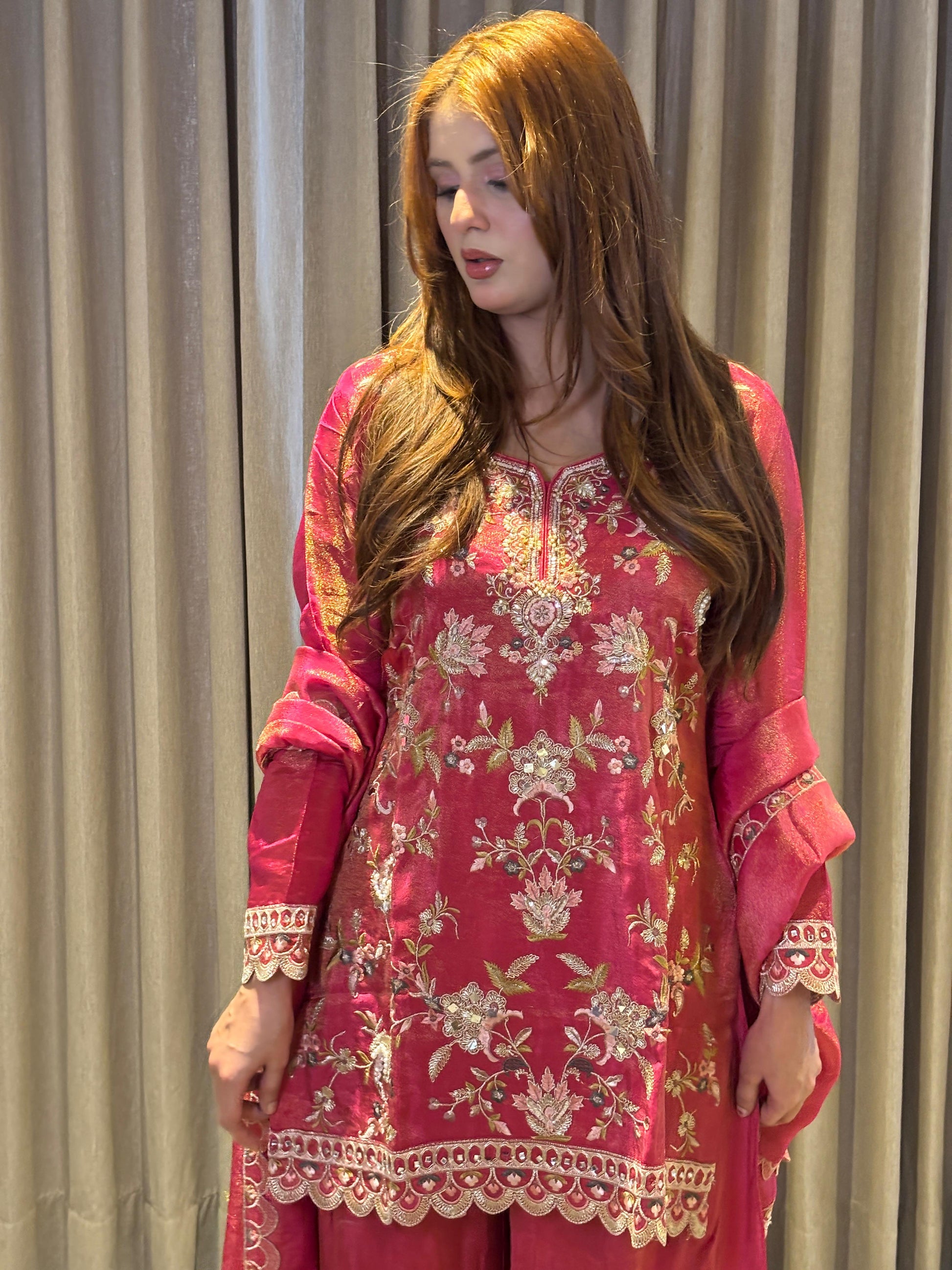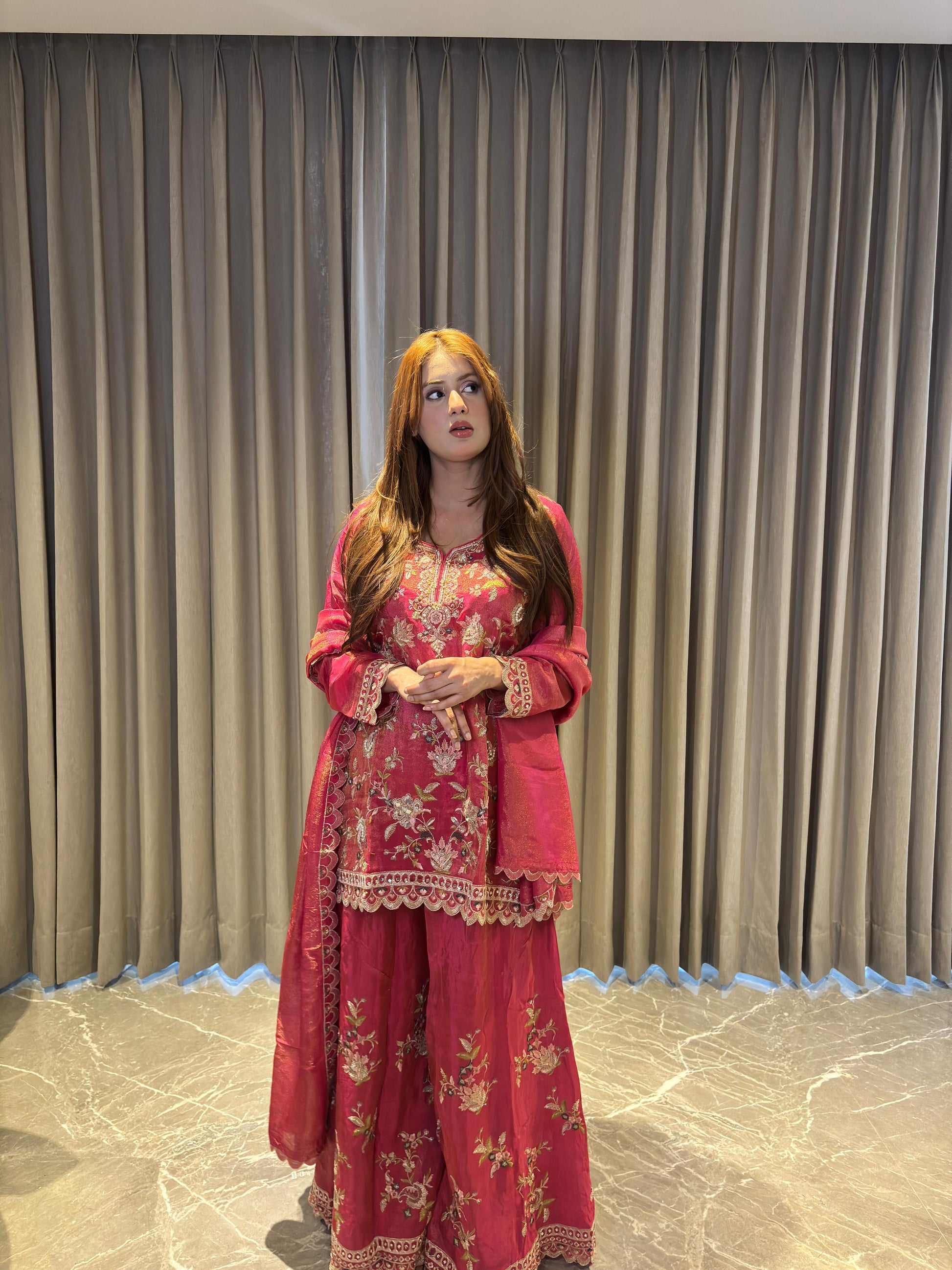 An ethereal red ensemble that glows with subtle shimmer and intricate threadwork. The suit features delicate embroidery accentuated with sequin details, giving it a graceful festive aura. Paired with wide palazzo pants adorned with floral motifs and tassel detailing, it balances elegance with a touch of modern flair. Ideal for evening gatherings and celebrations that call for timeless sophistication.