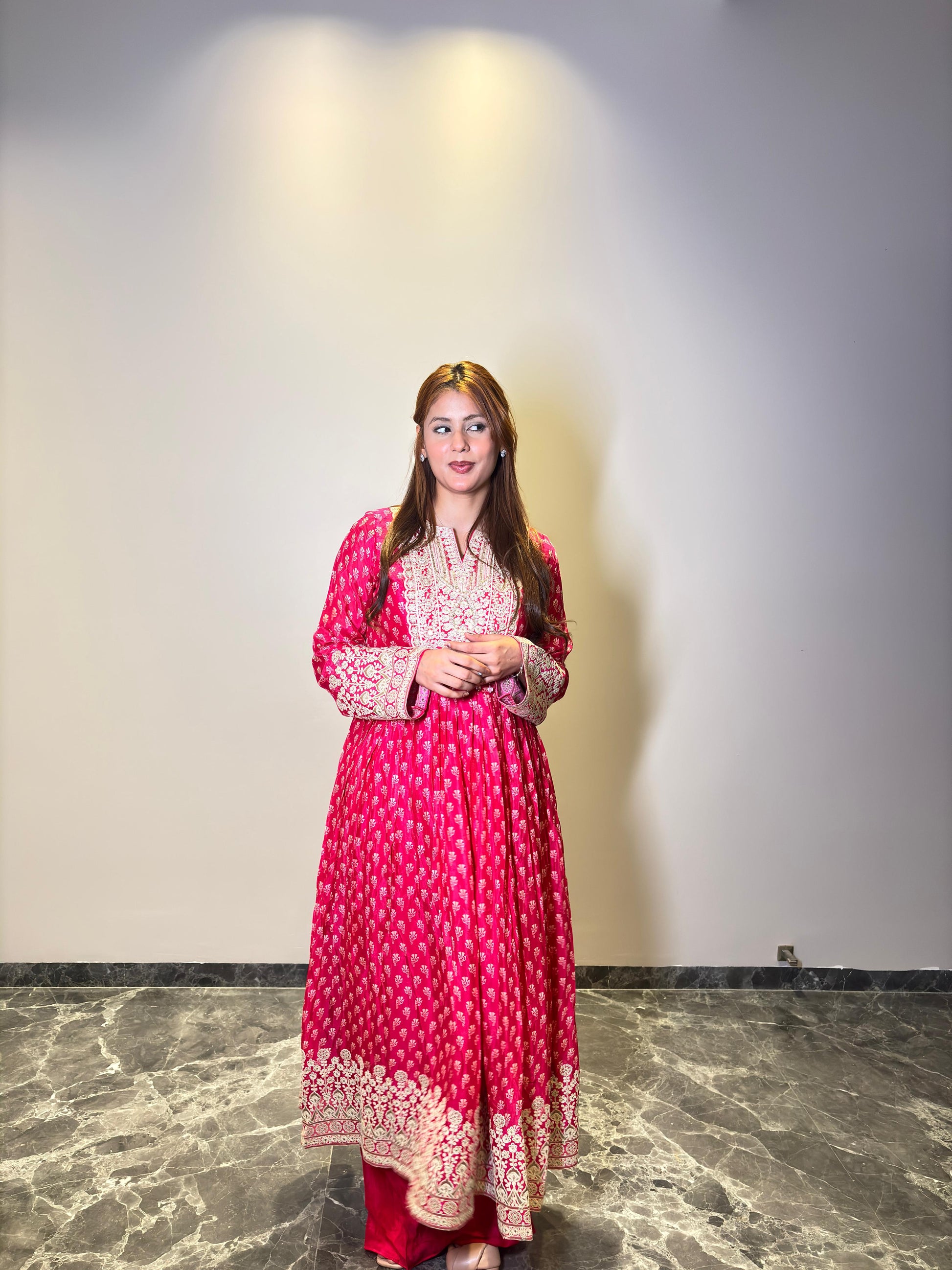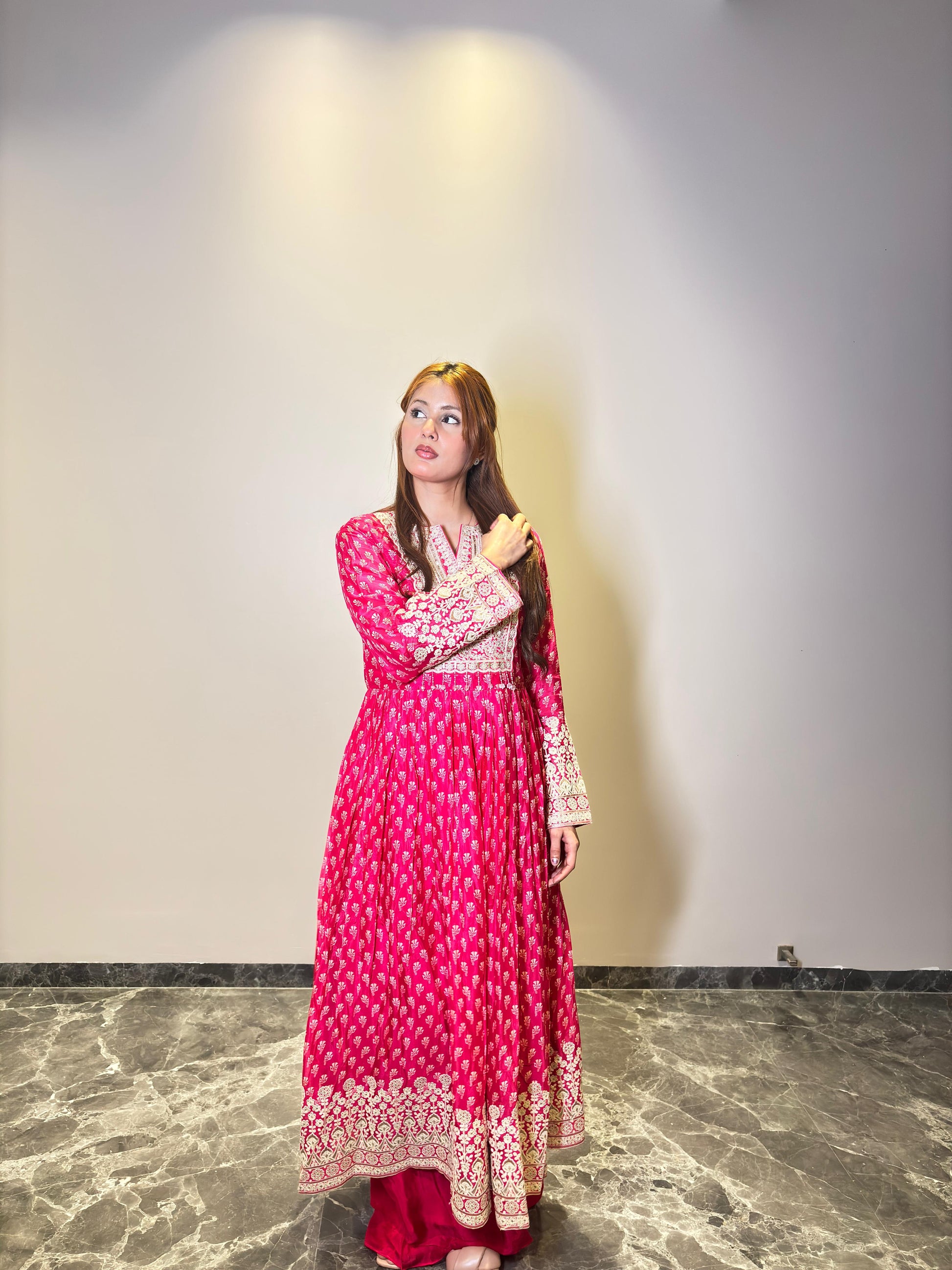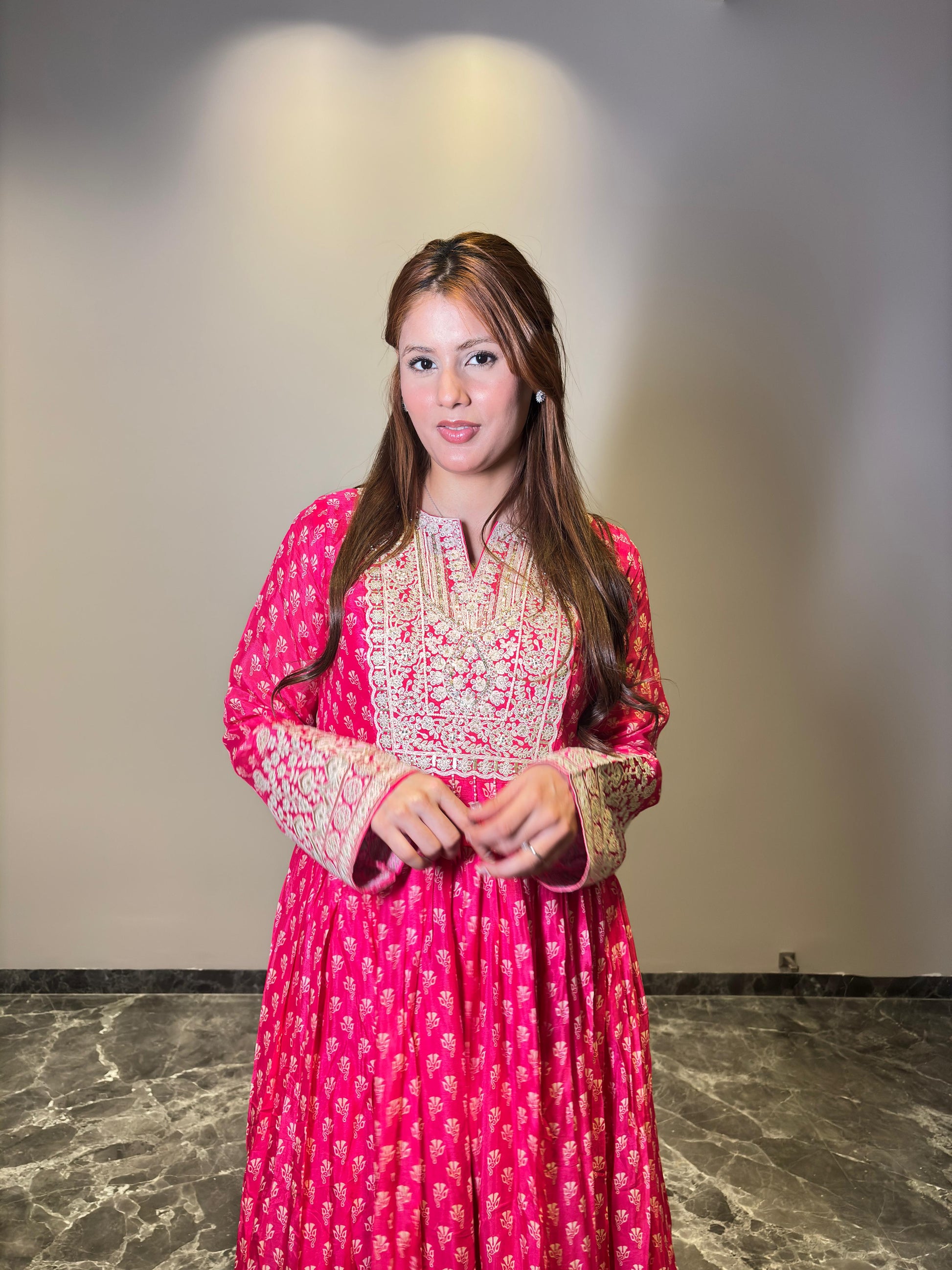Grace meets tradition in this vibrant pink Anarkali-style crepe suit, adorned with delicate golden block print and intricate embroidered detailing on the cuffs, hemline, and neckline. The flowy silhouette, crafted from lightweight crepe, offers effortless elegance and comfort. Paired with matching straight pants, this outfit is perfect for festive occasions and traditional gatherings.