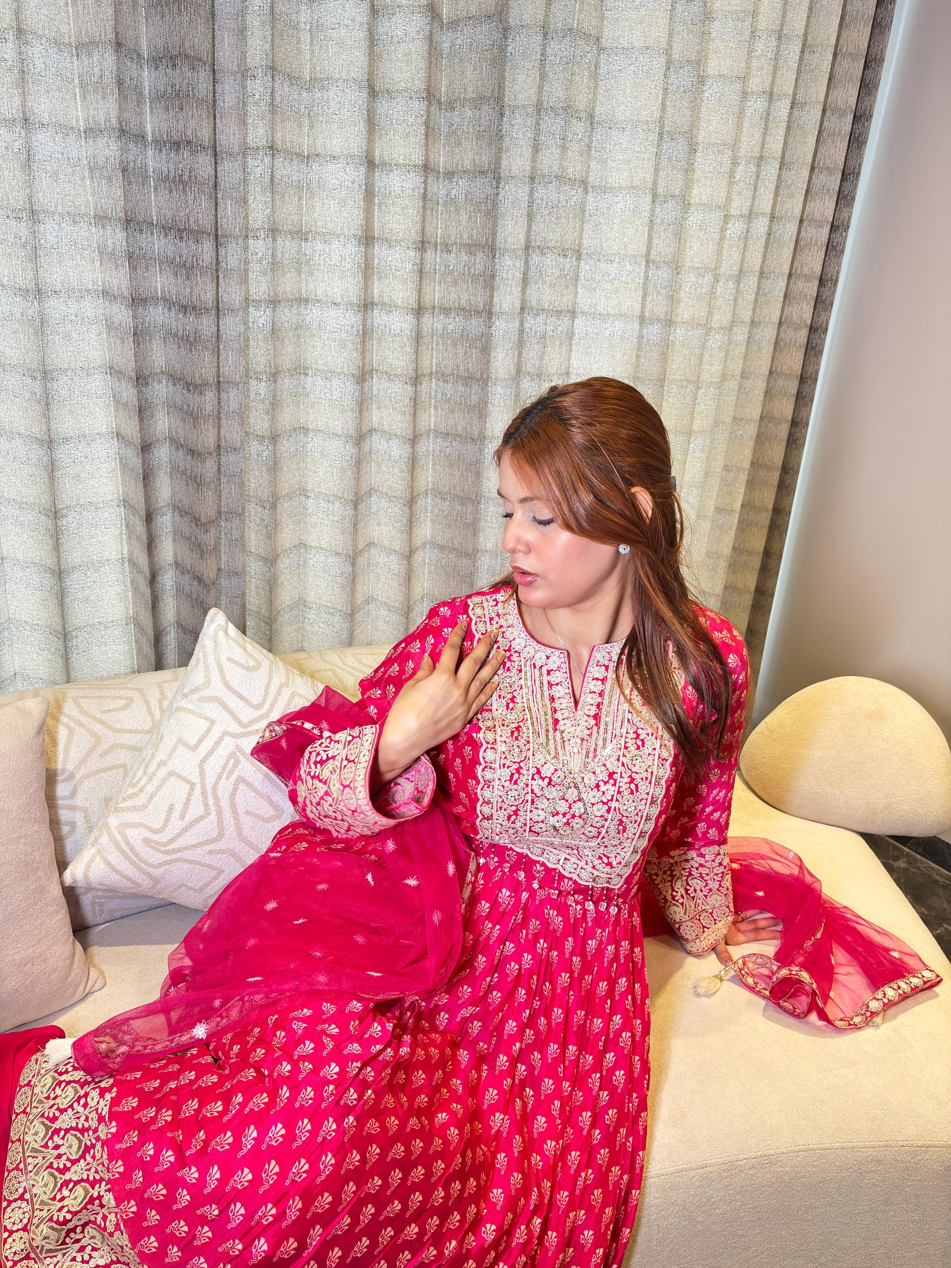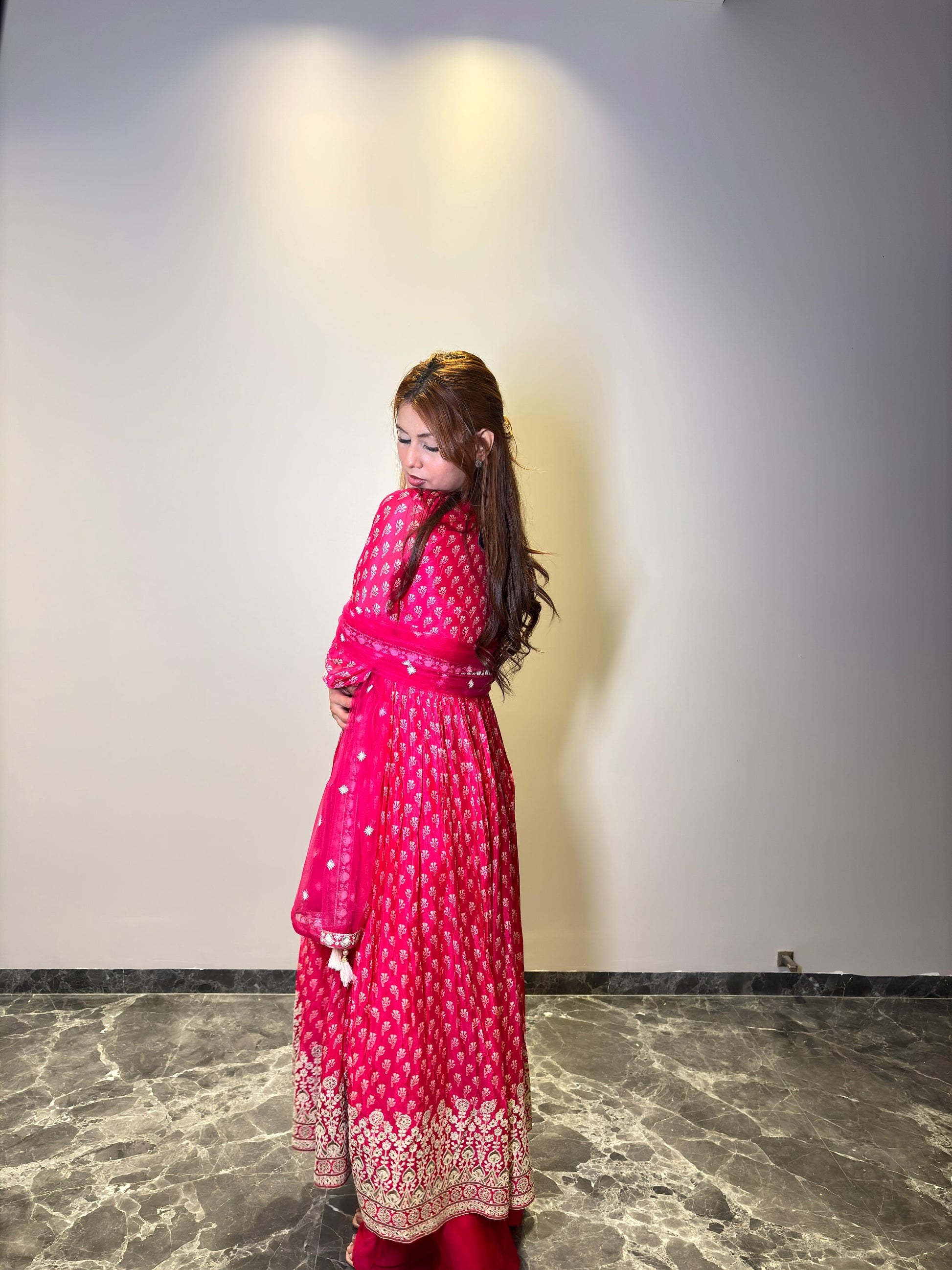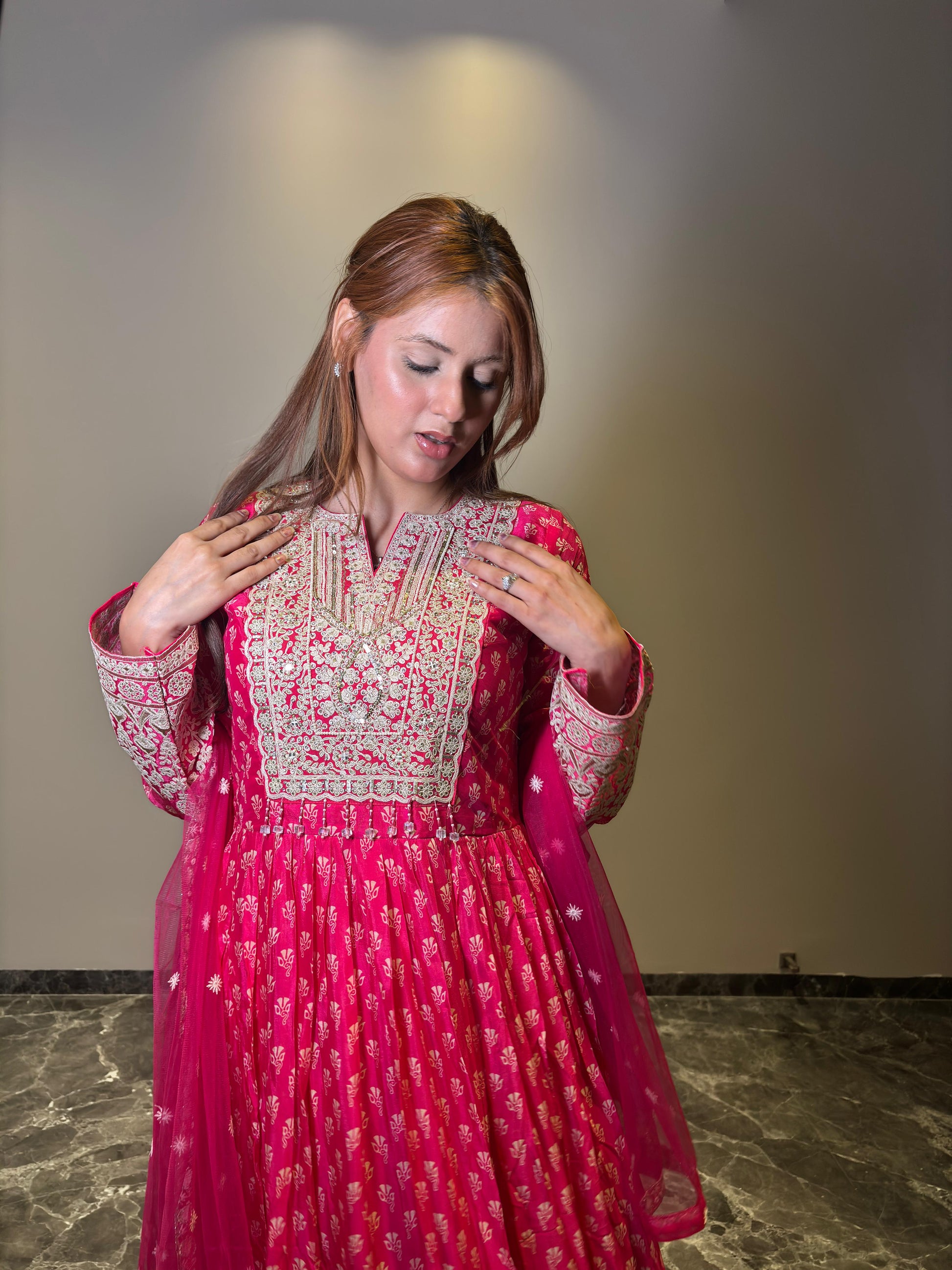 Grace meets tradition in this vibrant pink Anarkali-style crepe suit, adorned with delicate golden block print and intricate embroidered detailing on the cuffs, hemline, and neckline. The flowy silhouette, crafted from lightweight crepe, offers effortless elegance and comfort. Paired with matching straight pants, this outfit is perfect for festive occasions and traditional gatherings.