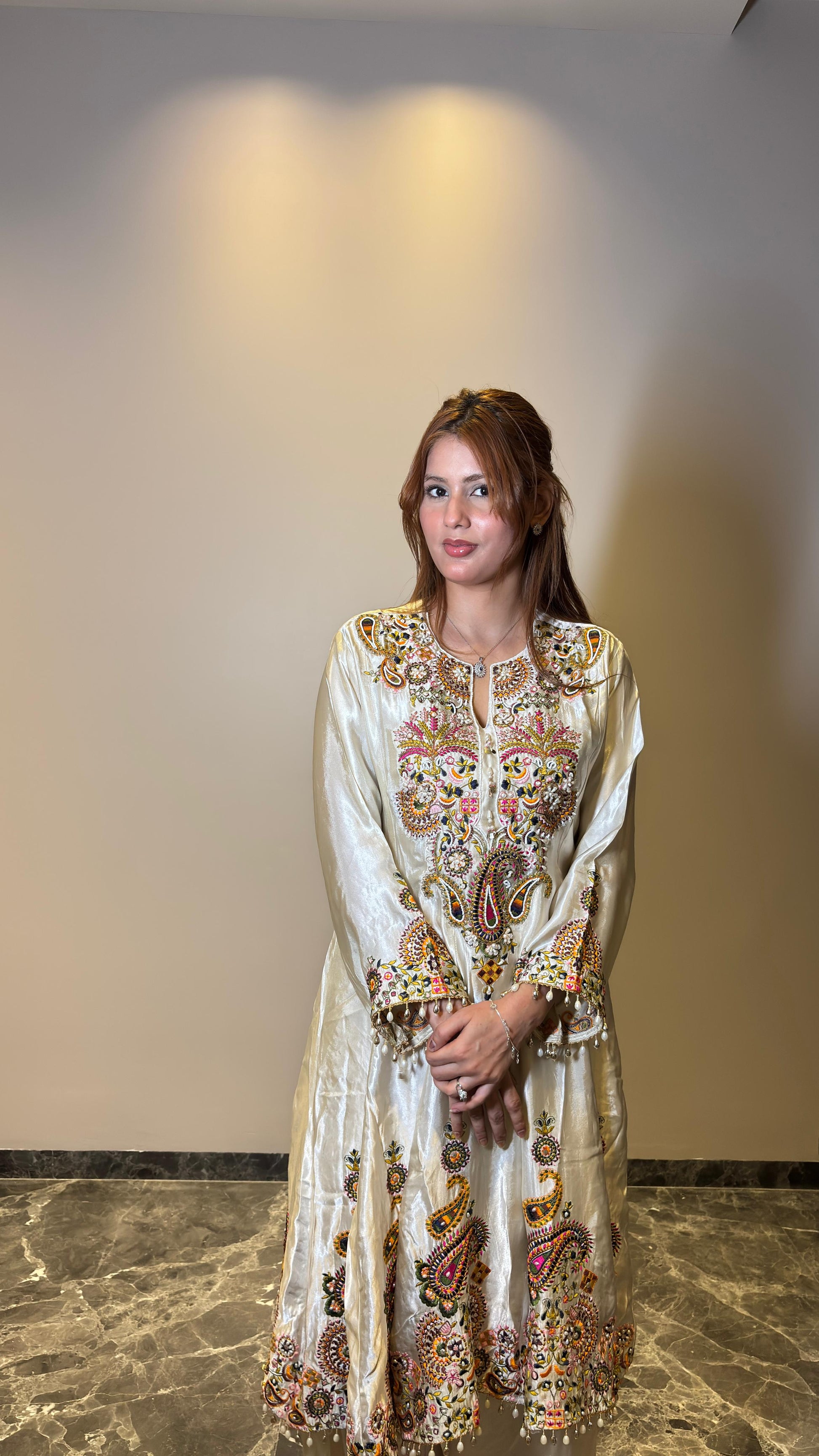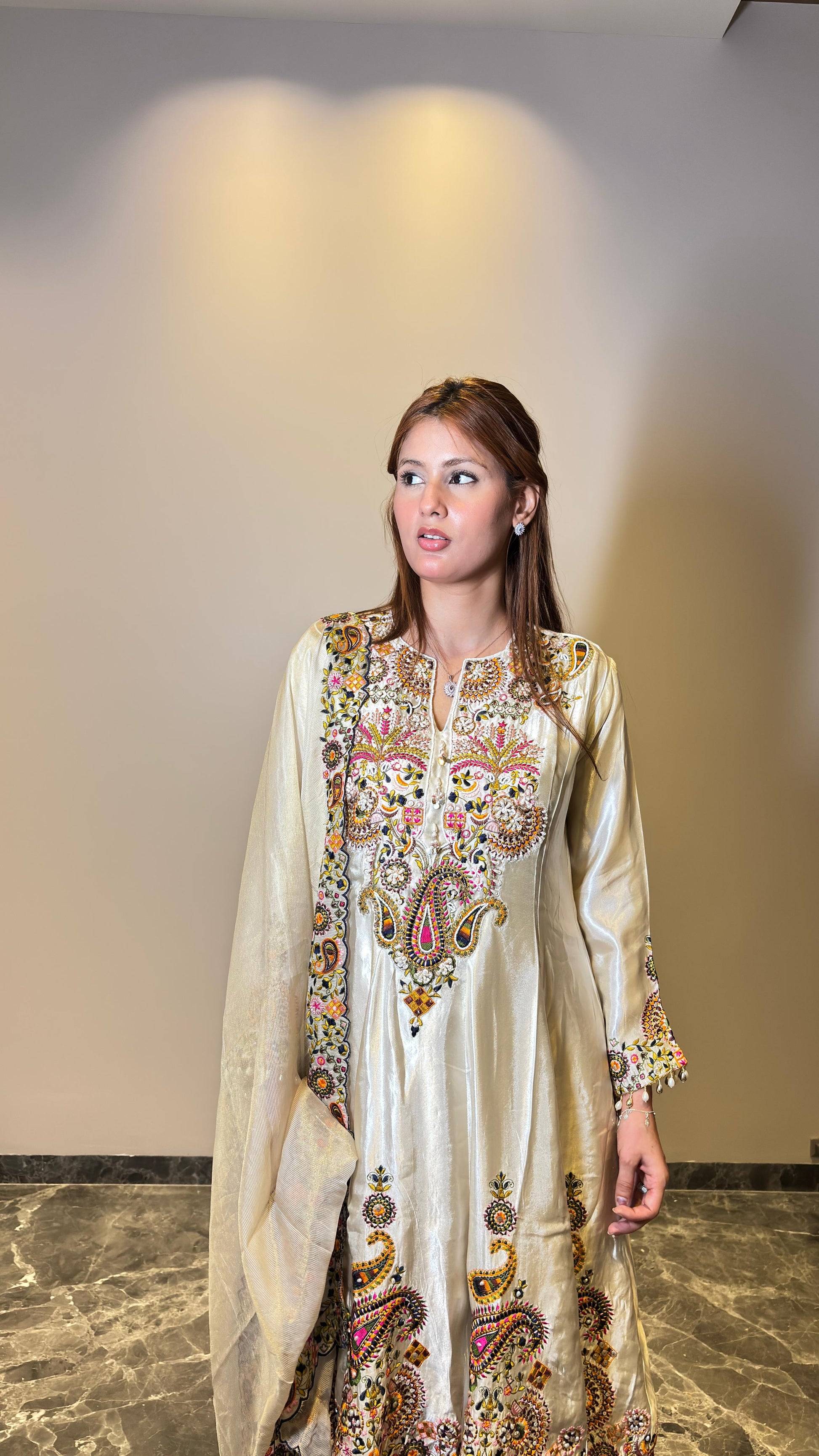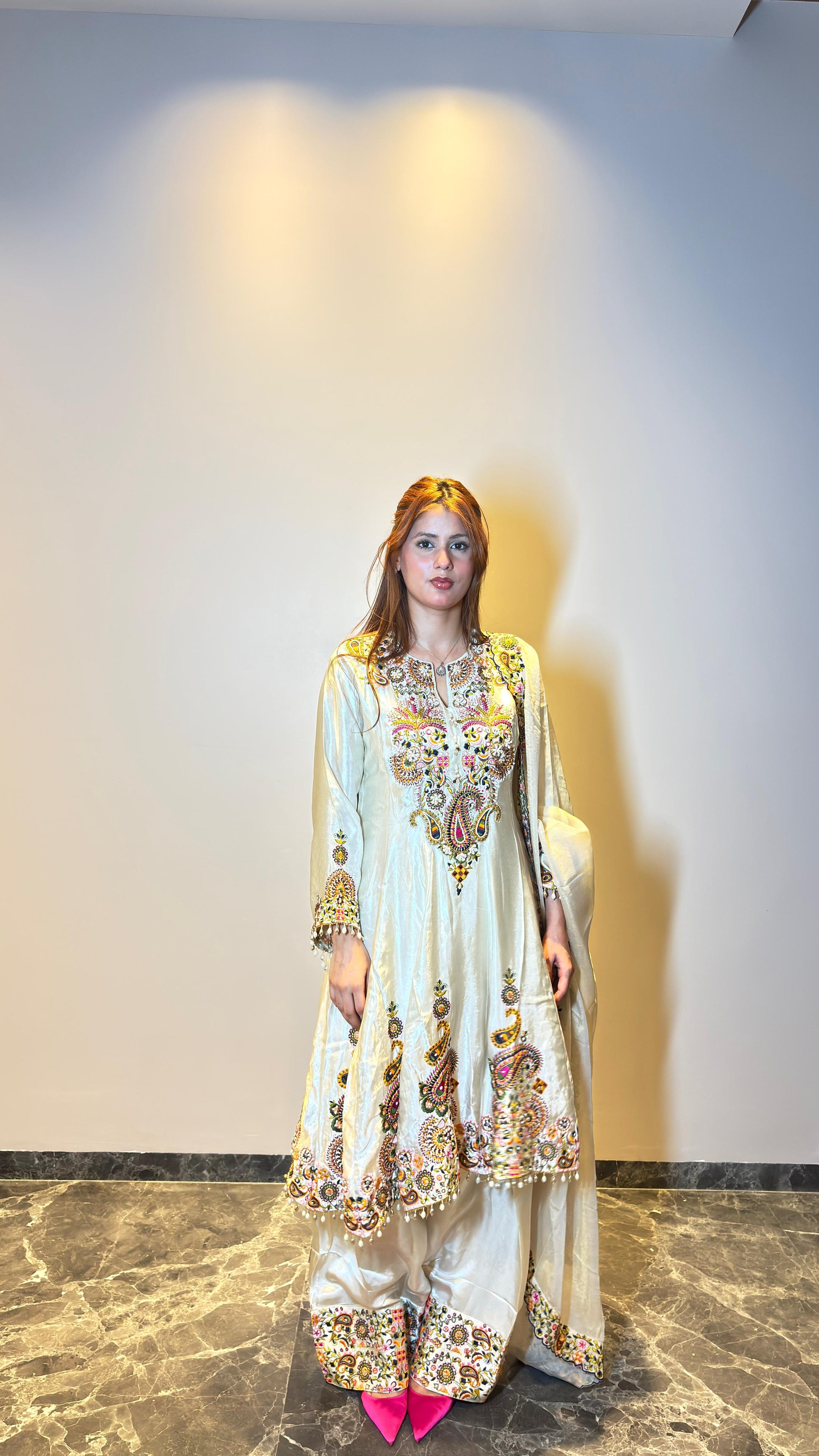 Modal silk satin with farsh salwar same fabric with organza dupatta wih border