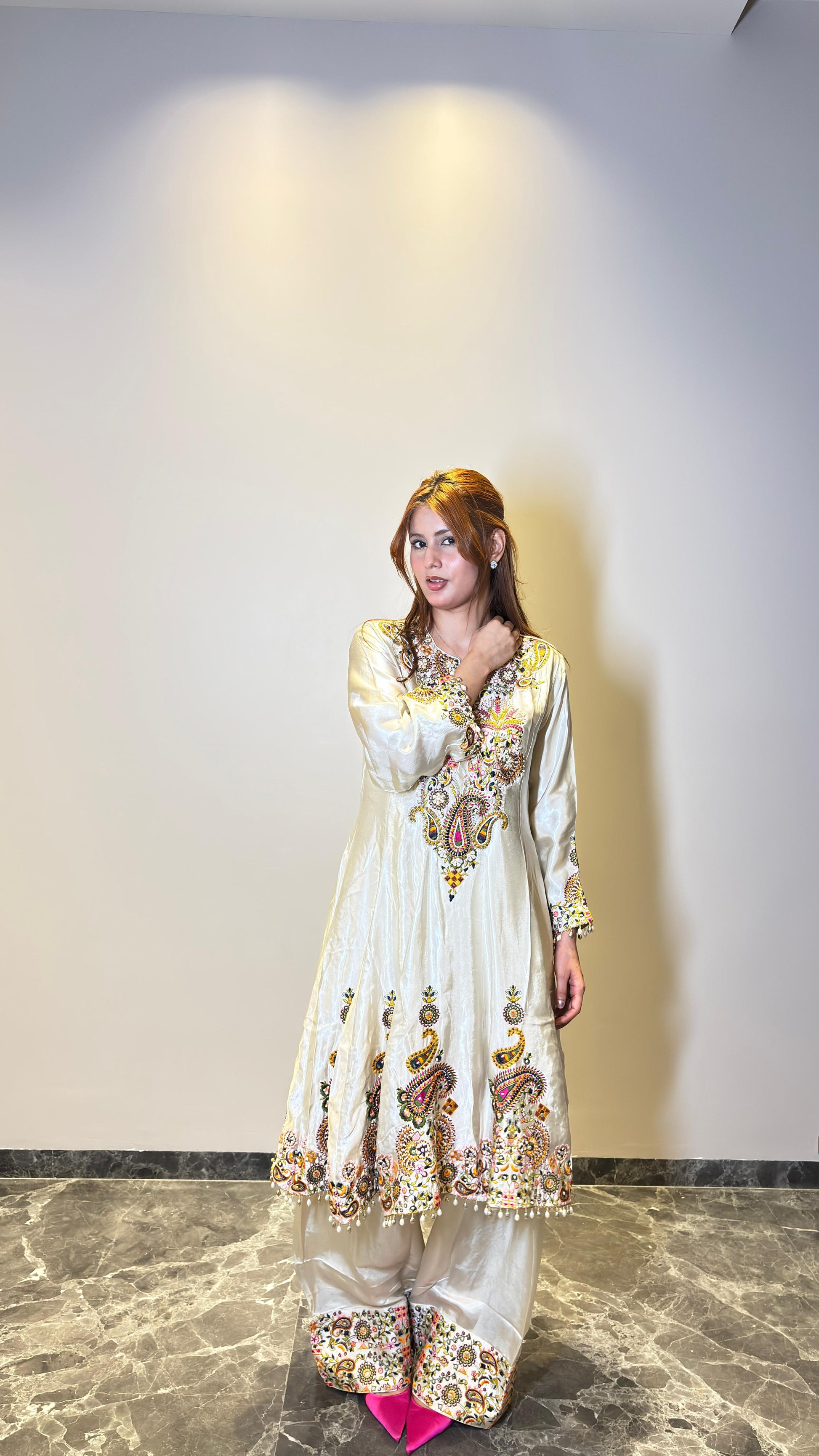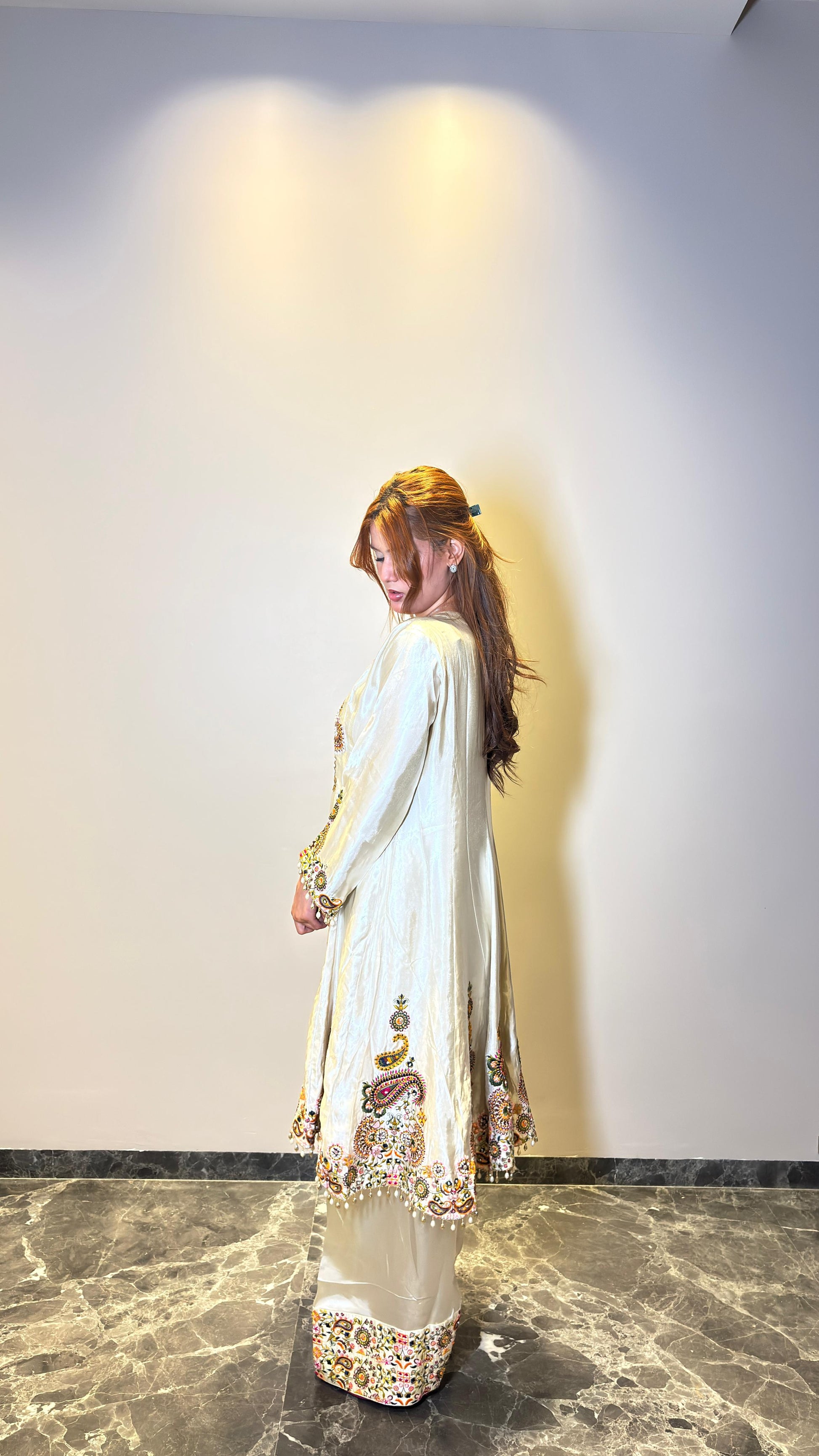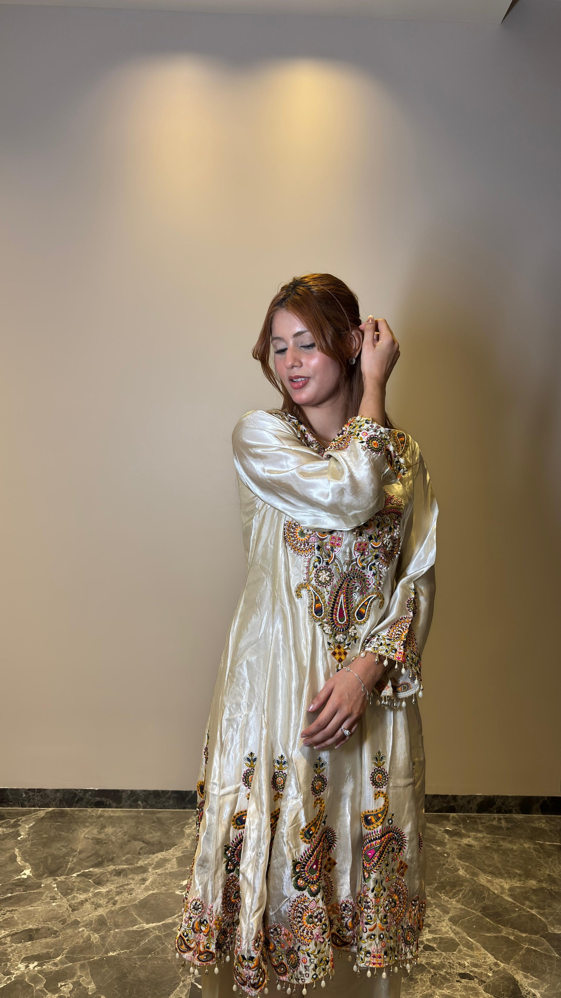 Modal silk satin with farsh salwar same fabric with organza dupatta wih border