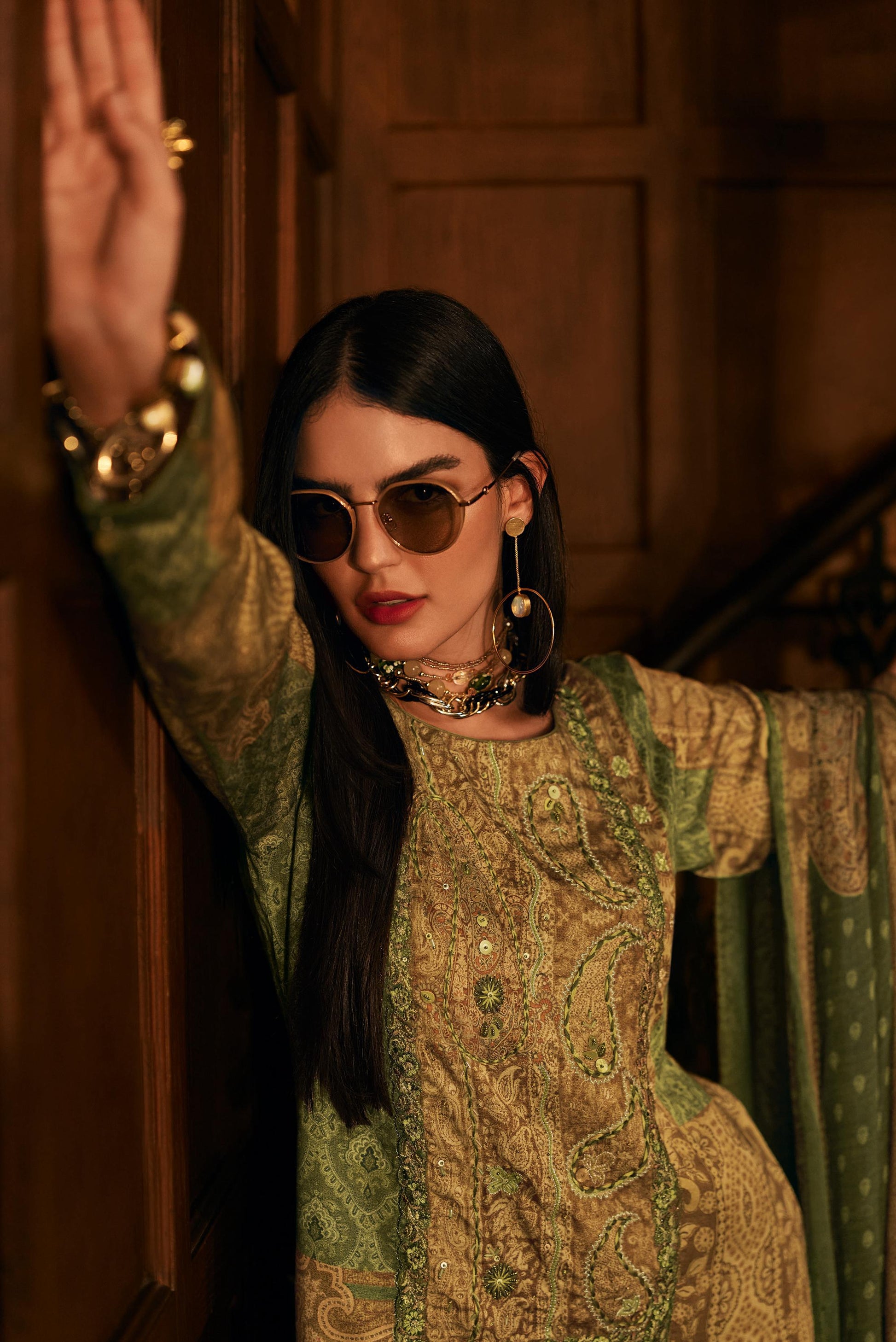 Viscose Pashmina Satin digitally printed with handwork and embroidery